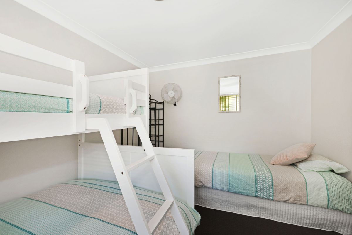 The master bedroom features a queen bed, ensuite, and built-in comfort, while the second bedroom is well-suited for families, offering a double bed with a single bunk above, plus an additional single bed. Both bedrooms include ceiling fans, and all linen is provided for your stay.