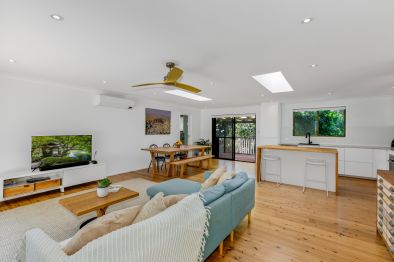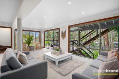 The entry hall leads to an impressive light filled space boasting masses of glass, vaulted ceilings and a stunning private bushland outlook. Solid timber floors, slow combustion fireplace and r/c air conditioning ensures all year comfort